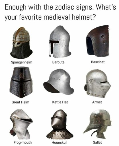 minus-squareP00ptart@lemmy.worldlinkfedilinkarrow-up5·26 days agoSpangenhelm! Duh. How has nobody else chosen it yet?