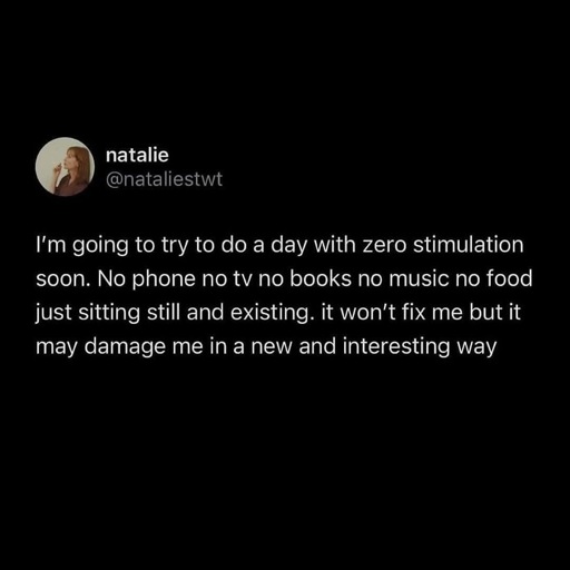 minus-squaretheneverfox@pawb.sociallinkfedilinkEnglisharrow-up0·2 months agoThere’s no such thing as zero stimulation But being out in nature makes it much easier to just sit and exist. Or wander around and exist