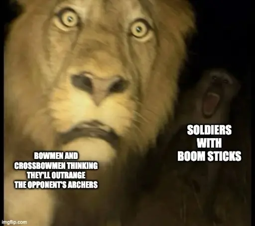 Second, that bows and crossbows have superior precision to early firearms, more than superior range - but precision matters less on a battlefield where the enemy is quite literally packed shoulder-to-shoulder for a mile or more. You don’t need to hit someone specific, just someone on the other side. Notably, this is one of the reasons why European matchlocks commonly lacked ironsights - as military weapons for mass formations, their interest was ‘hit SOMEONE over there’.