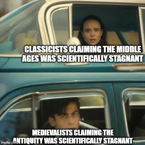 The actual point is that the periods are similar in advancement, with an edge to the medieval period if anything. If you damn the medieval period for stagnation you’re absolutely dunking on Romans spreading their advancements over literally a thousand years, or the Greeks and Persians getting their minds absolutely blown by the idea of “what if phalanxes, but with longer spears”