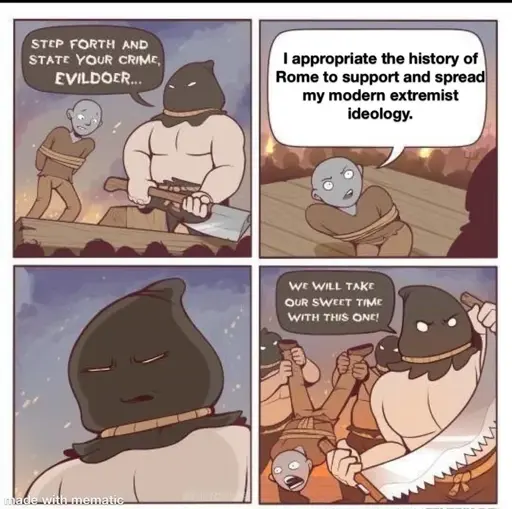 minus-squareNoneOfUrBusiness@fedia.iolinkfedilinkarrow-up8·13 days agoI appropriate the history of Rome to support and spread my extremist (radical leftist) ideology.